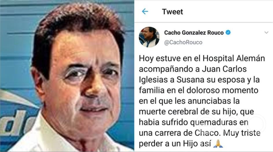 “Hoy estuve en el Hospital Alemán acompañando a Juan Carlos Iglesias a Susana su esposa y la familia en el doloroso momento en el que les anunciabas la muerte cerebral de su hijo, que había sufrido quemaduras en una carrera de Chaco. Muy triste perder a un Hijo así” expresó, y las muestras de dolor no se hicieron esperar.