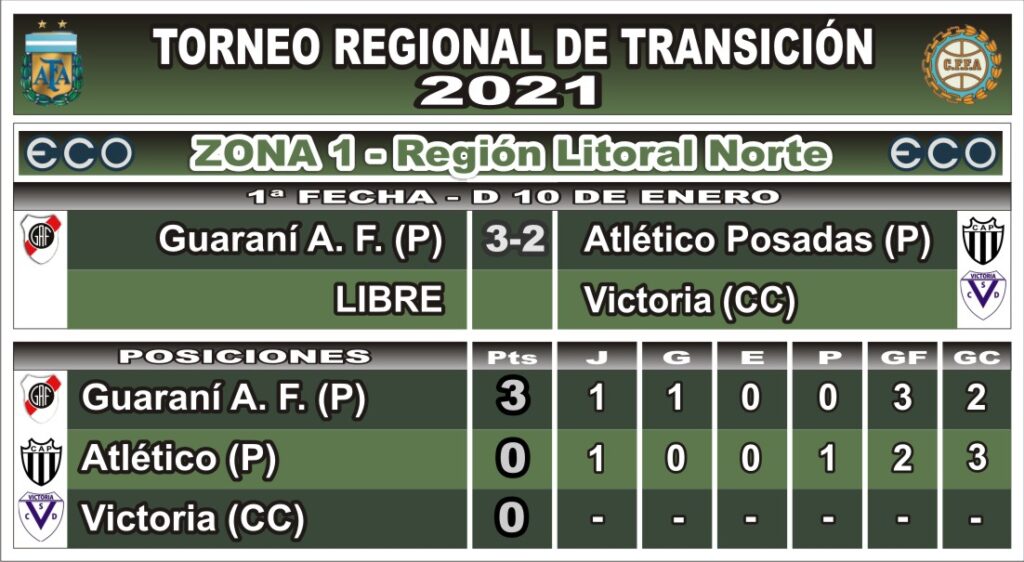 En el duelo de equipos de la capital misionera, Guaraní Antonio Franco venció a Atlético Posadas 3 a 2 por la primera fecha de la Zona 1 de la Región Litoral Norte. Para el conjunto “franjeado” anotaron Lucas Velázquez, Jorge Piñero Da Silva y Juan Rodríguez (en contra); y para el “albinegro” lo hicieron Nicolás Vallejos (en contra) y Juan Pablo Rodríguez, todos en el segundo tiempo.