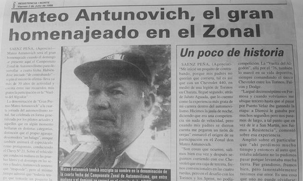 Férreo defensor de la marca, pasó luego a conducir el Chevy y así fue protagonista de innumerables carreras en pistas y rutas de la región. En 1999 la APICH de Sáenz Peña organizó en su honor el “Gran Premio Mateo Antunovich”, tributando un merecido homenaje a un hombre muy apreciado en el ambiente.
