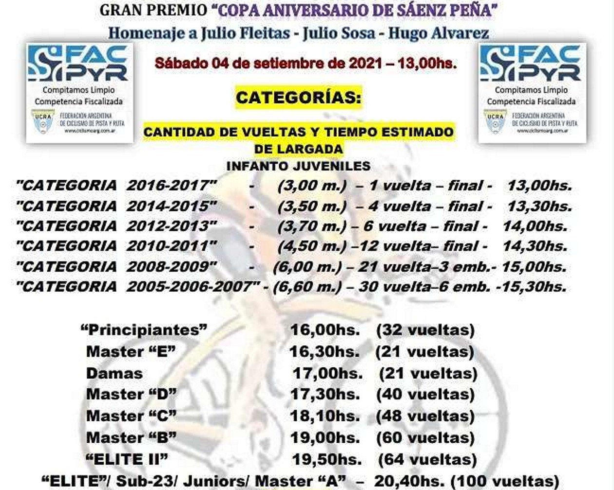 Con el decidido retorno de la actividad, el próximo sábado se disputará el Gran Premio “109º Aniversario de Sáenz Peña”, en el marco de la primera fecha del Campeonato Chaqueño de Ciclismo que se había pospuesto en un par de oportunidades. La actividad comenzará a las 13 y se extenderá durante toda la jornada.