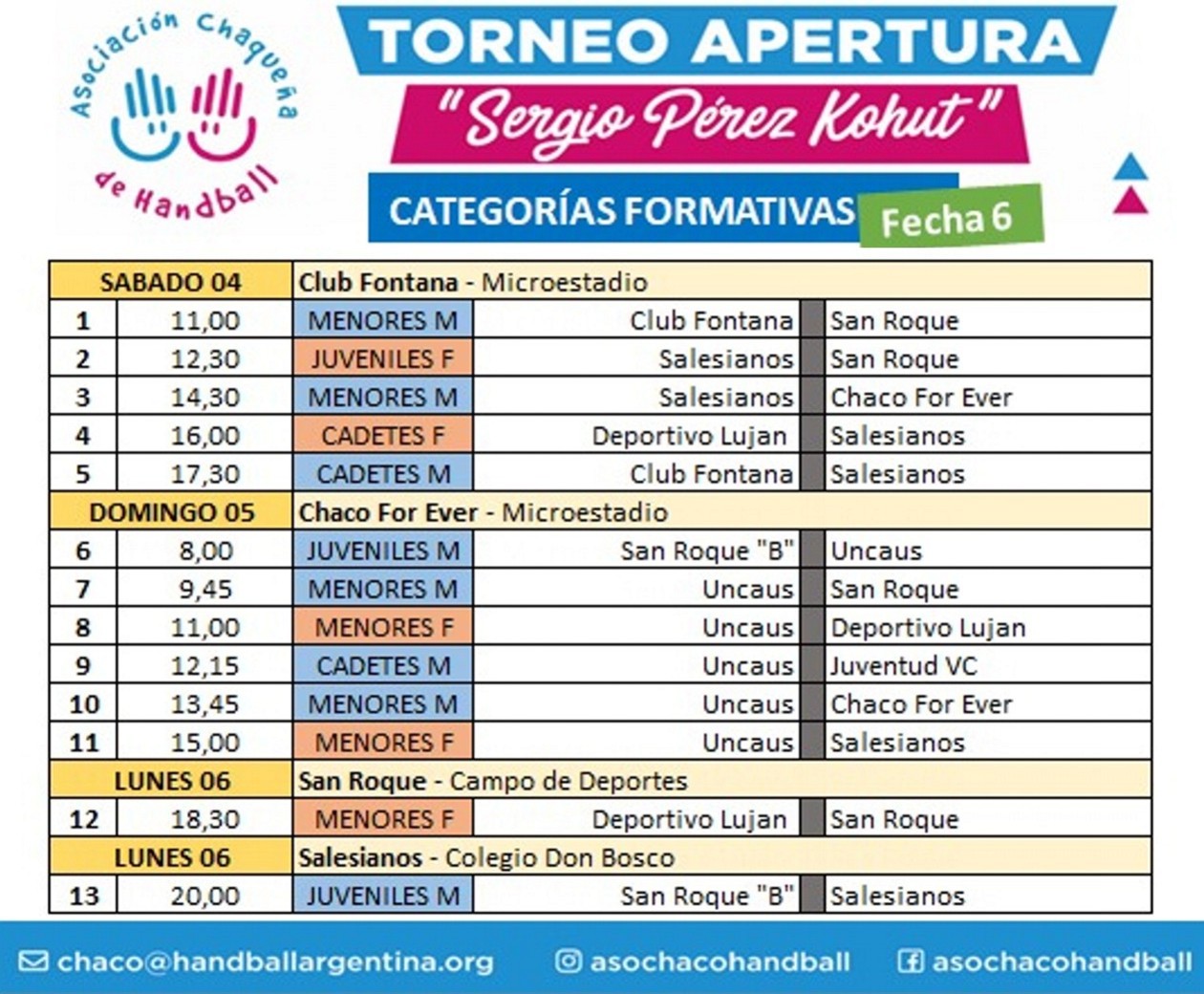 La Uncaus participará el próximo domingo en la sexta fecha del Torneo Apertura “Sergio Pérez Kohut” de la Asociación Chaqueña de Handball, que ingresa en etapa de definiciones. Los clubes Fontana y Chaco For Ever serán los principales anfitriones de esta jornada de categorías formativas.