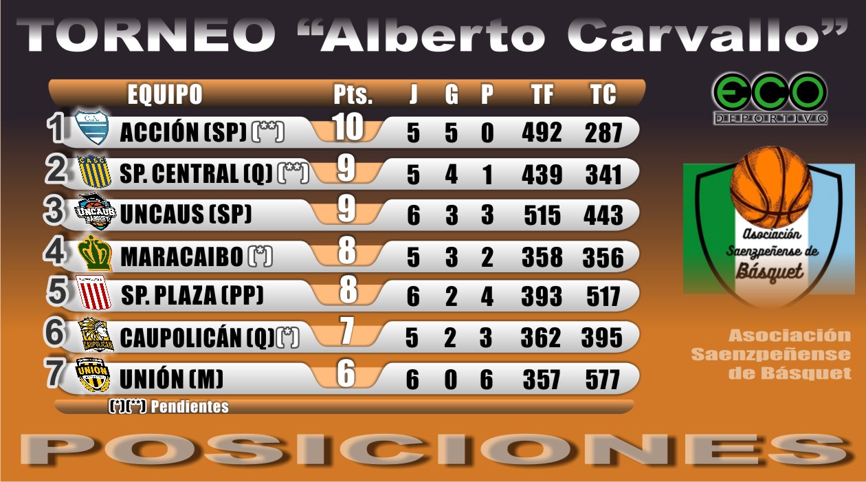 Con los enfrentamientos de Sportivo Plaza frente al líder Acción, y de Unión ante Caupolicán, este viernes se pondrá en marcha la octava fecha del Torneo Apertura “Alberto Carvallo” de la Asociación Saenzpeñense de Básquet. Quedará pendiente el duelo de escoltas entre Sportivo Central y Uncaus, por no contar con estadio.