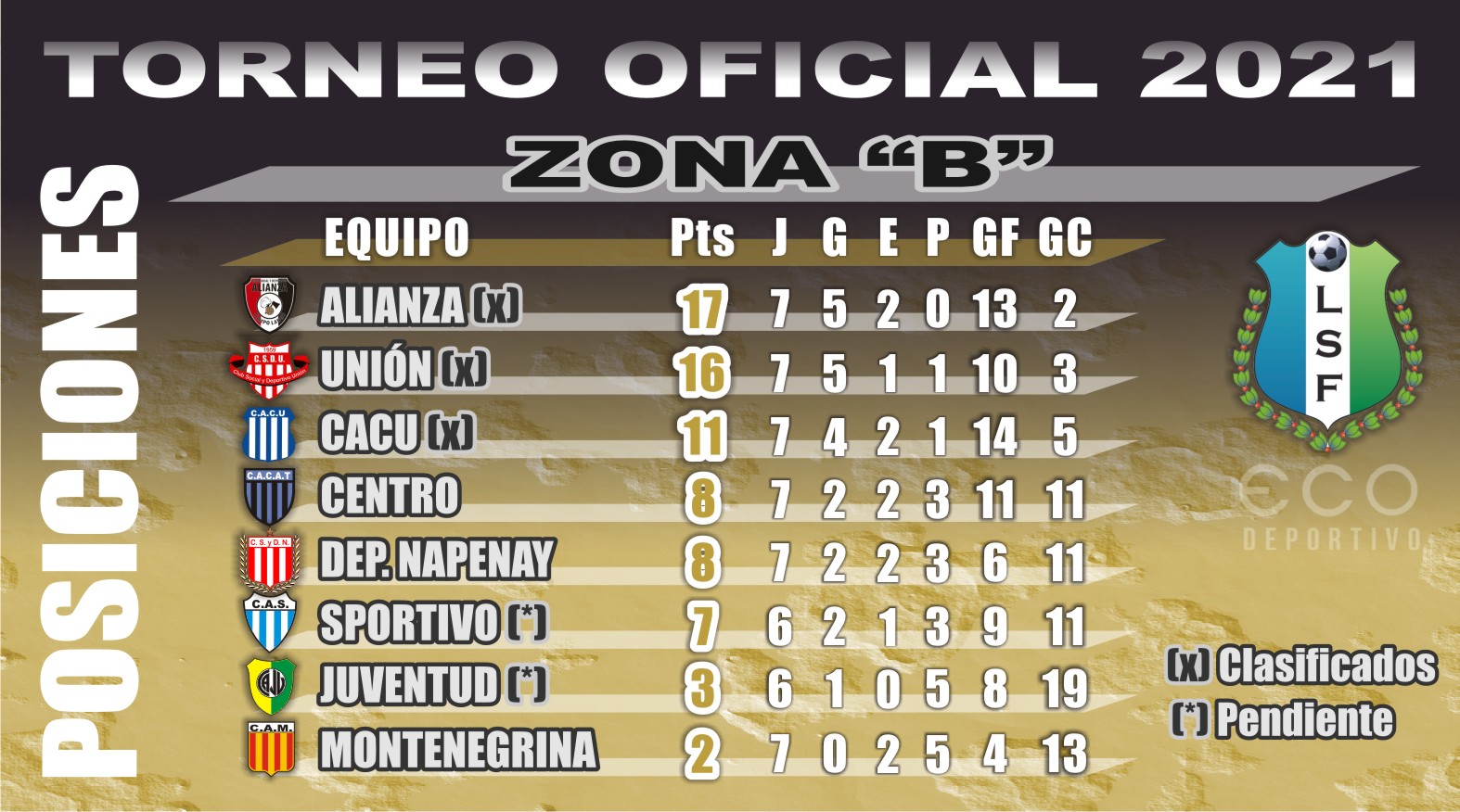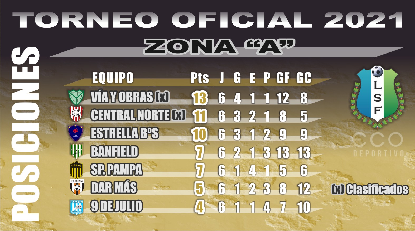 Debido a la paridad existente en la Zona “C”, donde faltan jugar los cuatro partidos de la séptima y última fecha, es imposible arriesgar las ubicaciones del primero al tercer lugar, aunque sí es seguro que el primer puesto será para un equipo de Castelli, Sportivo Cultural o Barrio Sarmiento, que juegan entre sí. Si gana el “Barrio” quedará en lo más alto, pero un empate o un triunfo “albiceleste” le otorgará esa posición a Cultural.