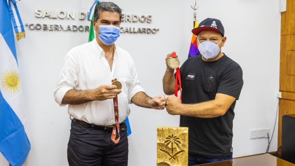 El mandatario provincial destacó en su cuenta de facebook que “su gran esfuerzo y fortaleza le permitió obtener una extraordinaria participación que lo ubicó entre los 5 mejores del mundo en la categoría de cuatriciclos”, mientras el corredor oriundo de Sáenz Peña exhibía las medallas obtenidas.