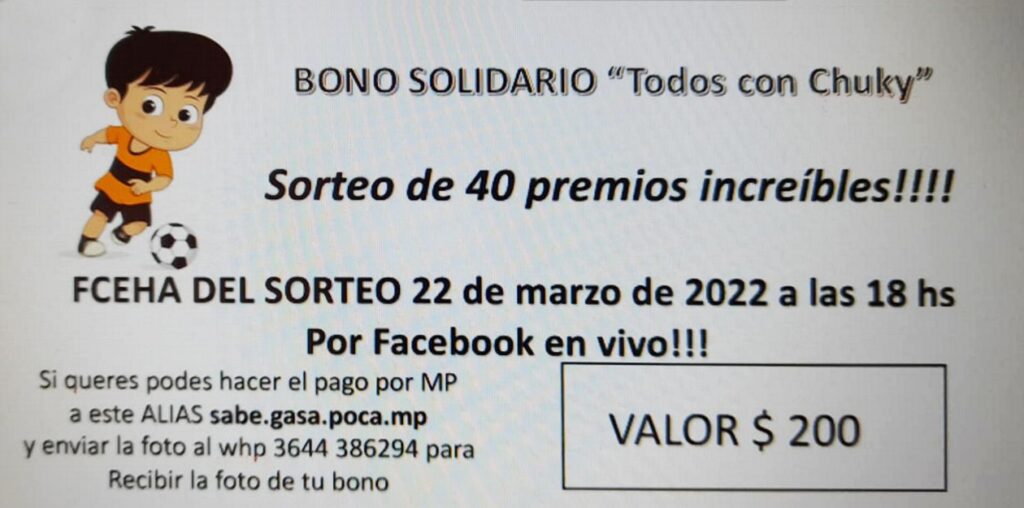 El sorteo se realizará mediante Facebook, con transmisión en vivo el 22 de marzo, aunque quienes puedan y desean colaborar también podrán hacerlo a través del CVU de Mercado Pago 0000003100013981194697. Para cualquier consulta o aporte, también se pondrán contactar con el teléfono 3644-386294.