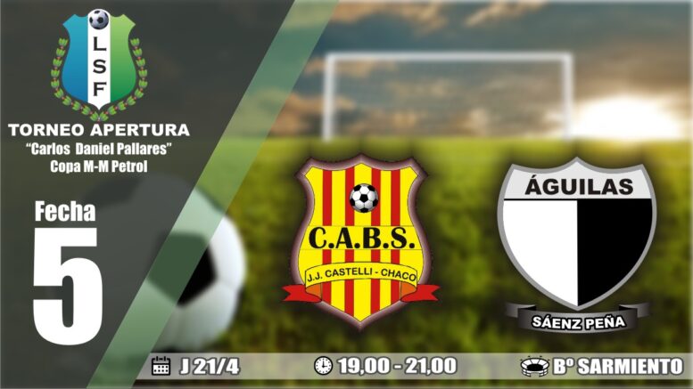 Barrio Sarmiento y Águilas protagonizarán hoy su duelo pendiente de la quinta fecha del Torneo Apertura “Carlos Daniel Pallares” Copa M-M Petrol de la Liga Saenzpeñense de Fútbol. Será a partir de las 19 en tercera división, y a las 21 en primera en Juan José Castelli.