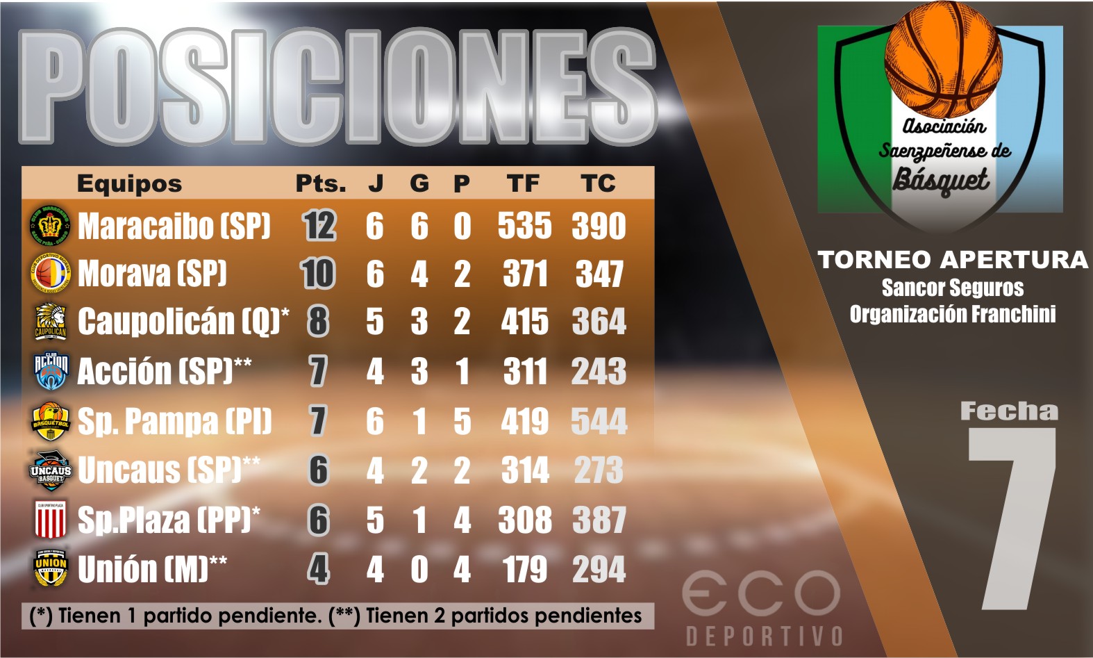 Maracaibo venció a Sportivo Plaza por 93 a 46 y estiró su invicto al disputarse de manera íntegra la séptima fecha del Torneo Apertura “Sancor Seguros – Organización Franchini” de la Asociación Saenzpeñense de Básquet, aunque quedan varios encuentros pendientes.
