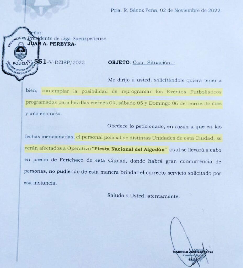 El comisario mayor Marcelo Kostecky, Jefe de la DZISP, elevó al titular liguista Carlos Alberto Pereyra una nota solicitando vea la posibilidad de liberar la tarea de los uniformados para abocarse al convocante evento que tendrá lugar entre el viernes 4 y domingo 6 en el predio ferial del barrio Monseñor de Carlo, ante la imposibilidad de poder dar cobertura a los partidos.