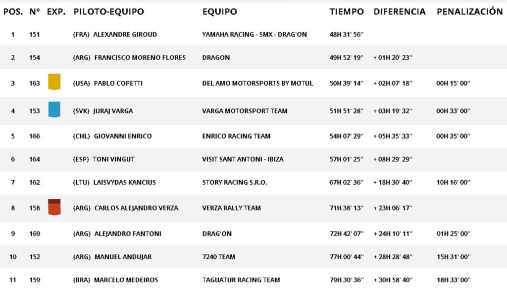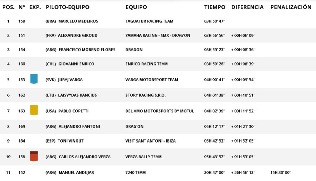 El brasilero Marcelo Medeiros selló su segundo triunfo en línea, empleando 3 horas 50 minutos y 47 segundos, escoltado por el francés Alexandre Giroud, quien sigue liderando la general, y Francisco Moreno Flores. Carlos Verza concluyó décimo a poco más de una hora cincuenta, y se vio favorecido por el abandono de Andujar para recuperar el octavo lugar.