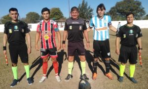 El árbitro Marcelo Salvatierra con sus asistentes y los capitanes César Sotelo, autor de tres goles, y Manuel Sáez