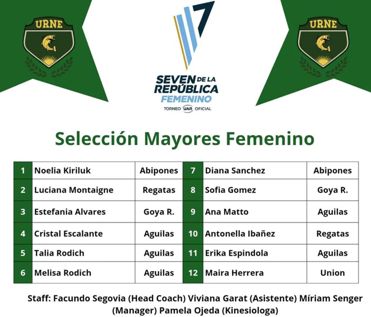 Las jugadoras Talia Rodich, Cristal Escalante, Melisa Rodich, Ana Matto y Erika Espíndola, integrantes de Las Águilas, fueron convocadas para ser parte de la selección de la URNE que entre sábado y domingo competirán en el Seven de la República que se realizará en Paraná, Entre Ríos.