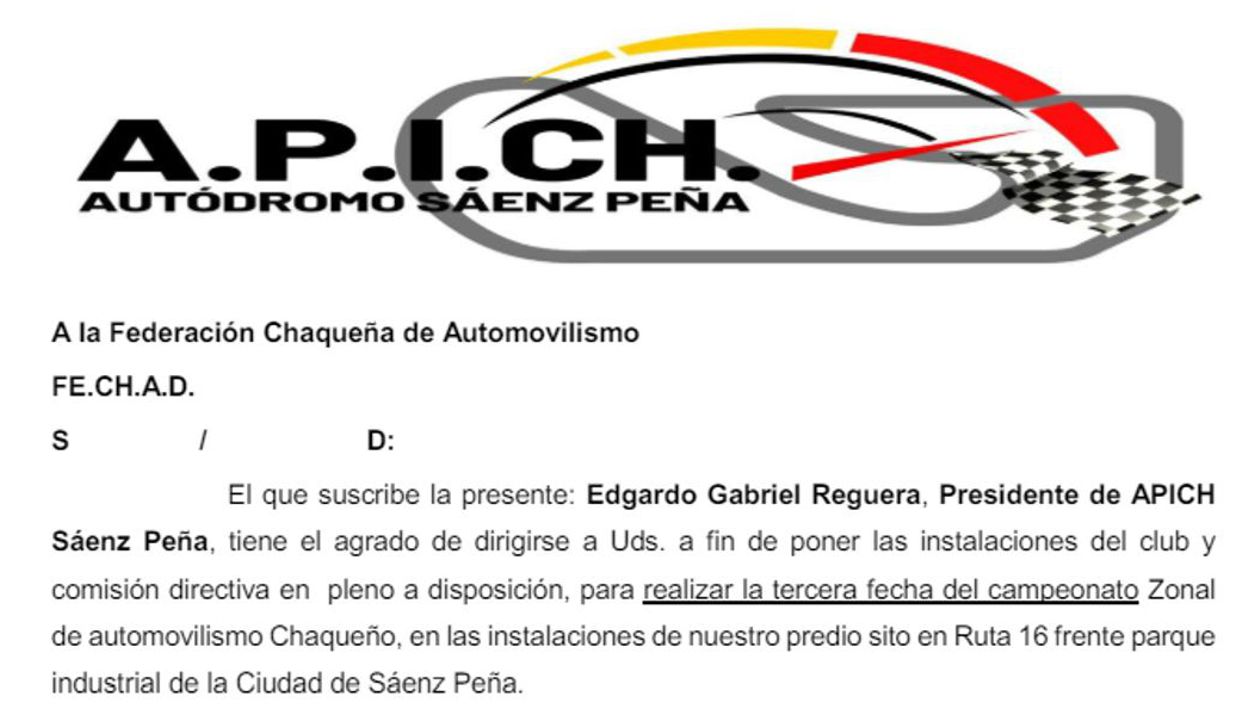 El propio presidente de la Asociación de Pilotos del Interior Chaqueño, Edgardo Reguera, efectuó la petición formal a la F.Ch.A.D. y puso a disposición las instalaciones del club para realizar la tercera fecha del Campeonato Zonal, aduciendo que está en condiciones para mantener la continuidad de la temporada hasta tanto se preparen otros circuitos.