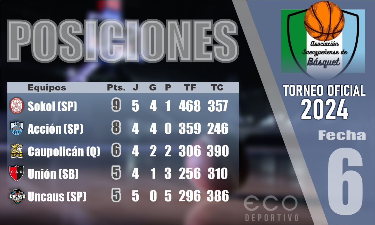 Con un claro 75 a 56 sobre el elenco de la Universidad Nacional de Chaco Austral, Sokol extendió su buen momento y alcanzó la punta del Torneo Oficial de la Asociación Saenzpeñense de Básquet, tras igualar en 32 al cabo de la primera etapa. El viernes se completará con Unión de San Bernardo frente al invicto Acción.