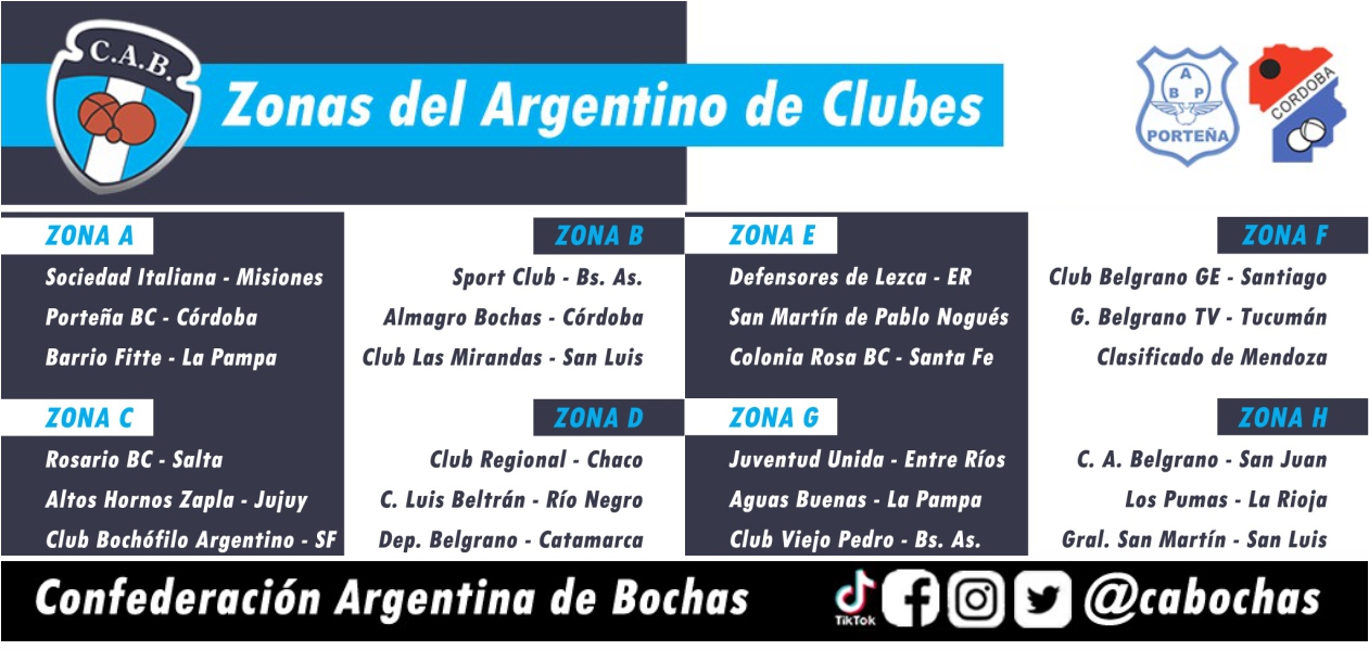 Participarán 24 clubes de todo el país, y el contingente de nuestra provincia lo hará en la Zona D junto con los clubes Luis Beltrán de Río Negro y Deportivo Belgrano de Catamarca. Según se informó desde la Confederación Argentina, la final está prevista para el sábado 21, a las 18,15, en la cancha N° 1 del Estadio del Porteña Bochas Club.