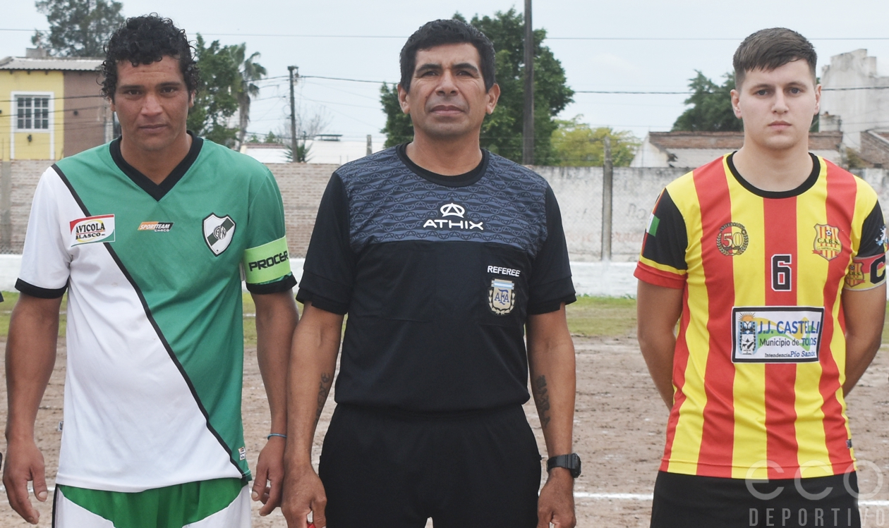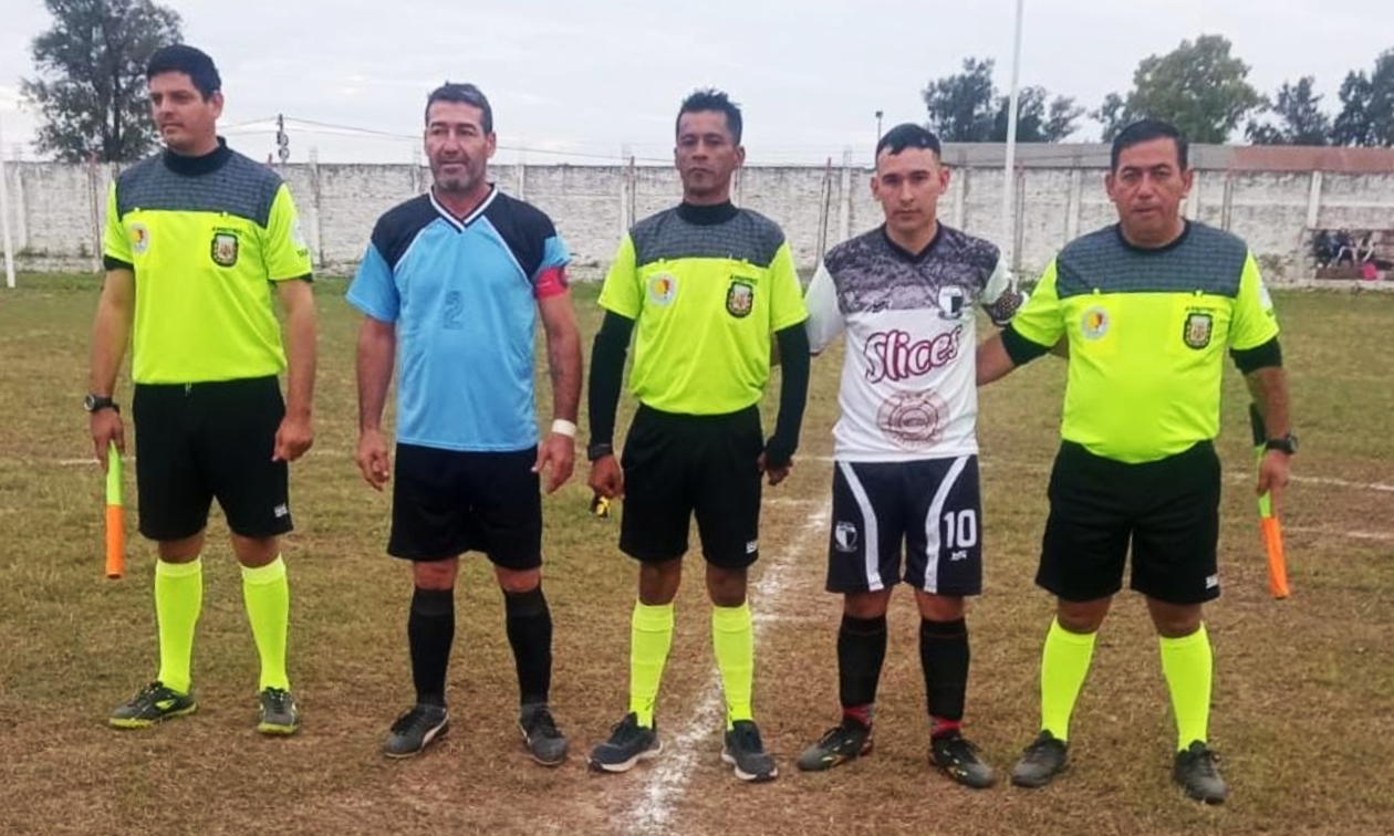 El árbitro Luis Paniagua con sus asistentes y los capitanes Javier Bonfanti (Olimpo) y Federico Malagueño (Águilas)