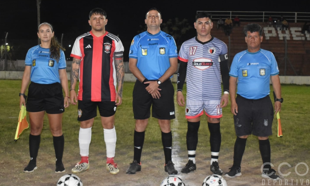 El árbitro Alfredo Guzmán con sus asistentes Stefany Núñez y Fabio Ramírez, junto con los capitanes Enzo Parayre y Mauricio Andrada
