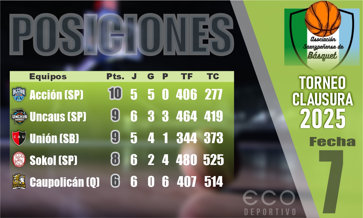 La Uncaus consumó su segunda victoria en poco menos de una semana y se ubicó como escolta del líder e invicto Acción. Fue por 108 a 76 frente a la Unión Gimnástica Sokol en compromiso que se hallaba pendiente de la cuarta fecha del Torneo Clausura de primera división de la Asociación Saenzpeñense de Básquet.