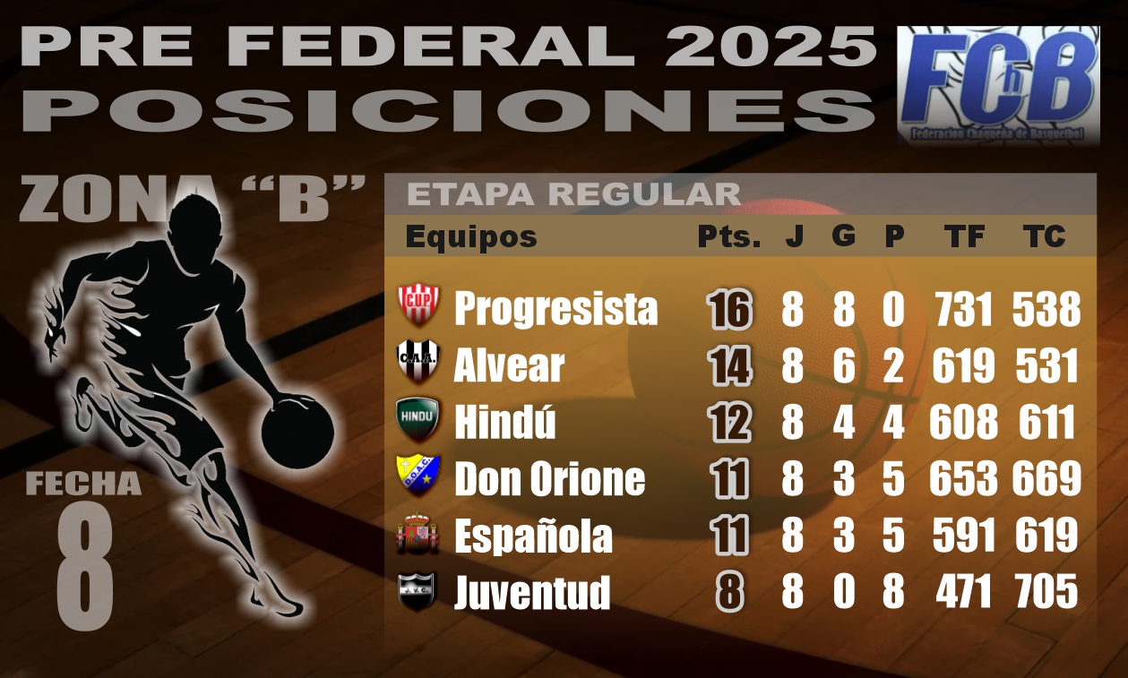 De acuerdo con los marcadores registrados en esta jornada, los villangelenses Unión Progresista y Alvear confirmaron de manera anticipada su presencia en cuartos de final, pues el “albirrojo” derrotó en casa a Juventud por 97 a 54, en duelo de extremos; y el “albinegro” venció en Charata a Española 71 a 69. Por el mismo grupo, Hindú derrotó a Don Orione 99 a 80.