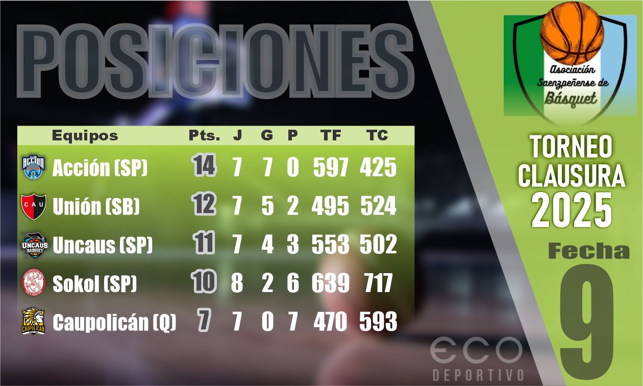 La novena y penúltima jornada del Torneo Clausura de la Asociación Saenzpeñense de Básquet, en primera división, le permitió a Acción extender su invicto y asegurarse el primer lugar de la fase regular con su victoria de visitante frente a Unión por 88 a 72. En el otro juego, Uncaus derrotó a Sokol 89 a 83.