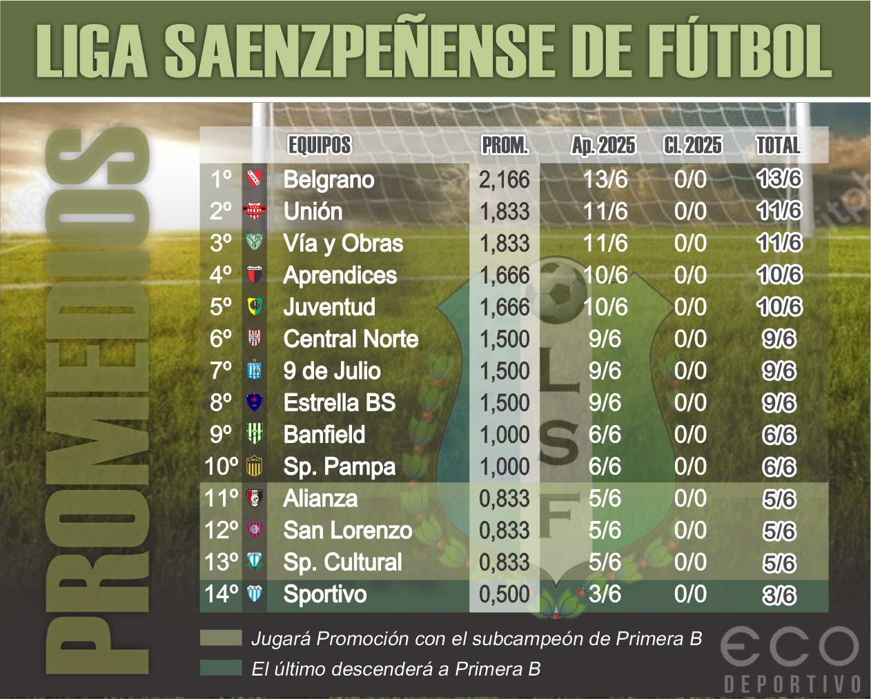 El “decano” Club Atlético Sportivo es el más comprometido, al haber concluido con solo 3 puntos tras los seis partidos disputados en el Apertura (0,500). Está obligado a una buena cosecha, y en el arranque de la segunda mitad de la temporada deberá afrontar el clásico con Belgrano, nada menos que el último campeón, y que se encuentran en los extremos de esta tabla.