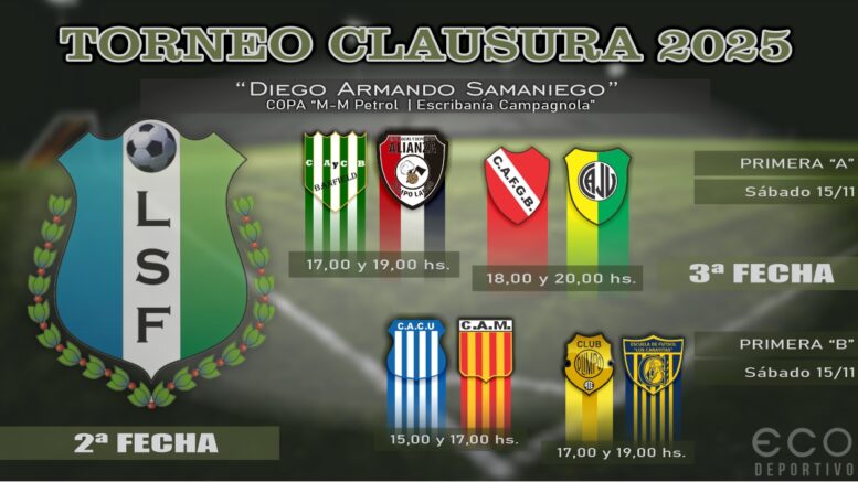 Dos partidos de la División “A” y otros dos de la “B” componen la atractiva programación de sábado que tiene el Torneo Clausura “Diego Samaniego” de la Liga Saenzpeñense de Fútbol. Banfield-Alianza se miden en Bermejo, y Belgrano-Juventud en el barrio Lamadrid por la tercera fecha de la categoría superior; y CACU-La Montenegrina y Olimpo-Canayas por la segunda jornada del certamen de ascenso.