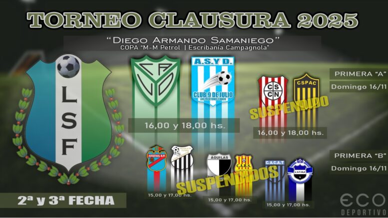 Desde la secretaría de la LSF se informó oficialmente que fue suspendido el encuentro de Central Norte ante Sportivo Pampa, que debía jugarse esta tarde en Concepción del Bermejo por la tercera fecha del certamen en la categoría superior, y también está pendiente el duelo de San Lorenzo-Unión.