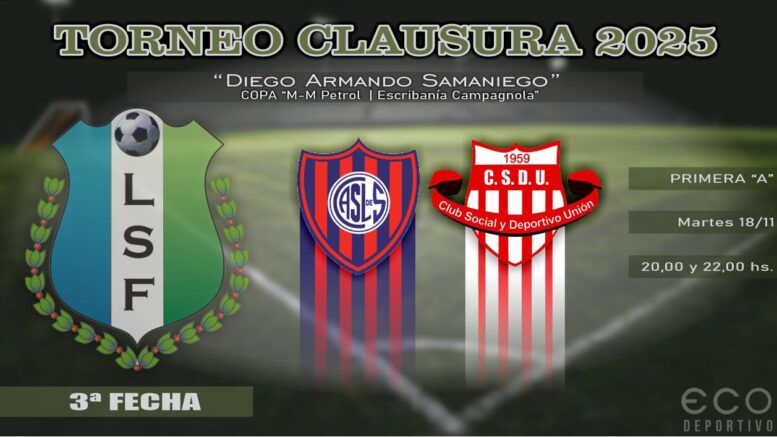 Finalmente hoy se disputará el encuentro pendiente de San Lorenzo con Unión, correspondiente a la tercera fecha del Torneo Clausura “Diego Samaniego” de la Liga Saenzpeñense de Fútbol. El encuentro tendrá lugar a las 22 en el estadio de Sportivo, con arbitraje de Leonel Silva.