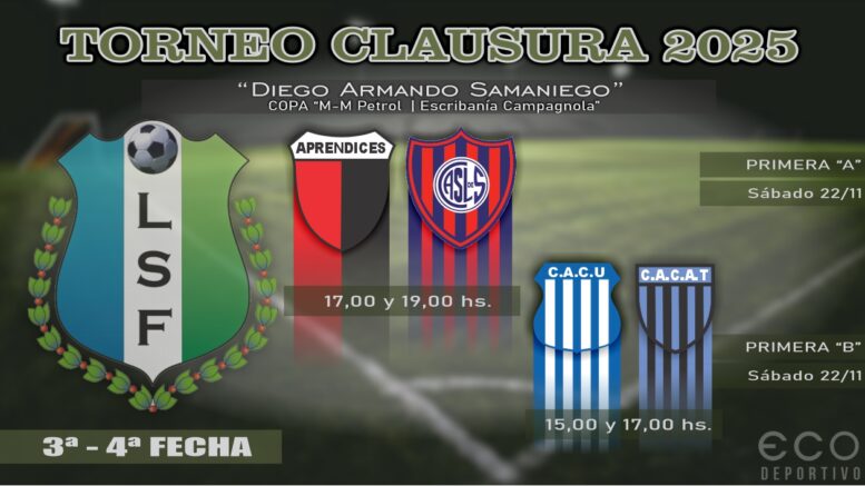 Los enfrentamientos de Aprendices ante San Lorenzo, por la cuarta fecha de la División “A”, y de CACU con Centro por la tercera jornada de la “B”, componen la atractiva propuesta del sábado del Torneo Clausura “Diego Samaniego” de la Liga Saenzpeñense de Fútbol.