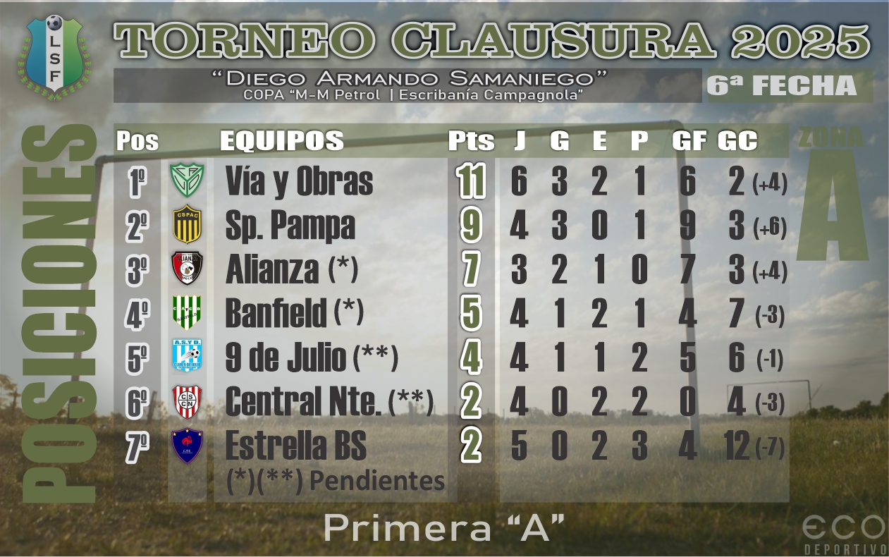 Estrella del barrio Sur y Central Norte no se sacaron ventajas y empataron 1 a 1 su compromiso correspondiente a la sexta fecha del Torneo Clausura “Diego Samaniego” de la Liga Saenzpeñense de Fútbol, que se disputó en Pampa del Infierno.
