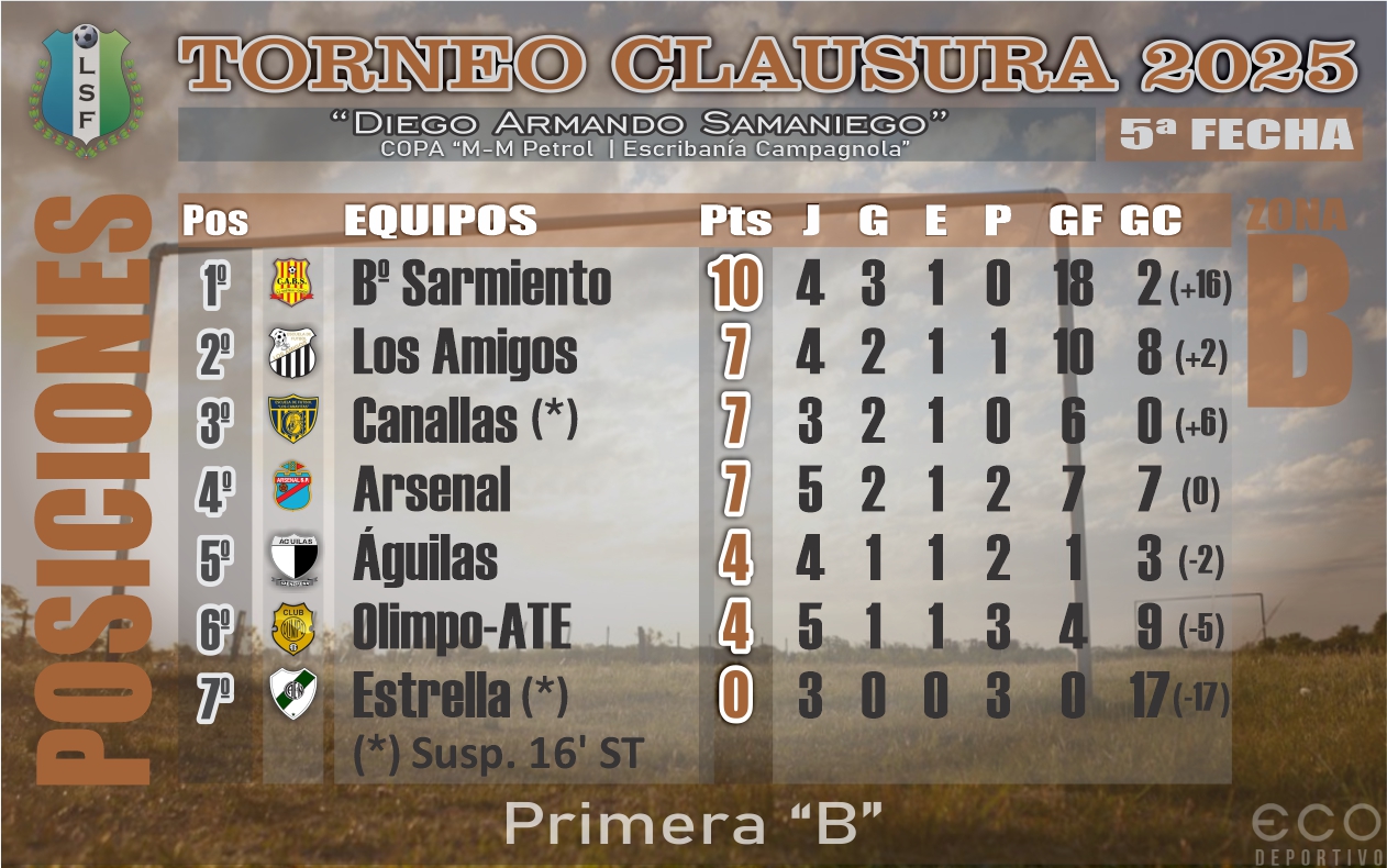 Luego del empate registrado la jornada anterior, Barrio Sarmiento derrotó en Juan José Castelli a Los Amigos por 5 a 1 para instalarse anticipadamente en cuartos de final del Torneo Clausura “Diego Armando Samaniego” de la Liga Saenzpeñense de Fútbol en la División B.