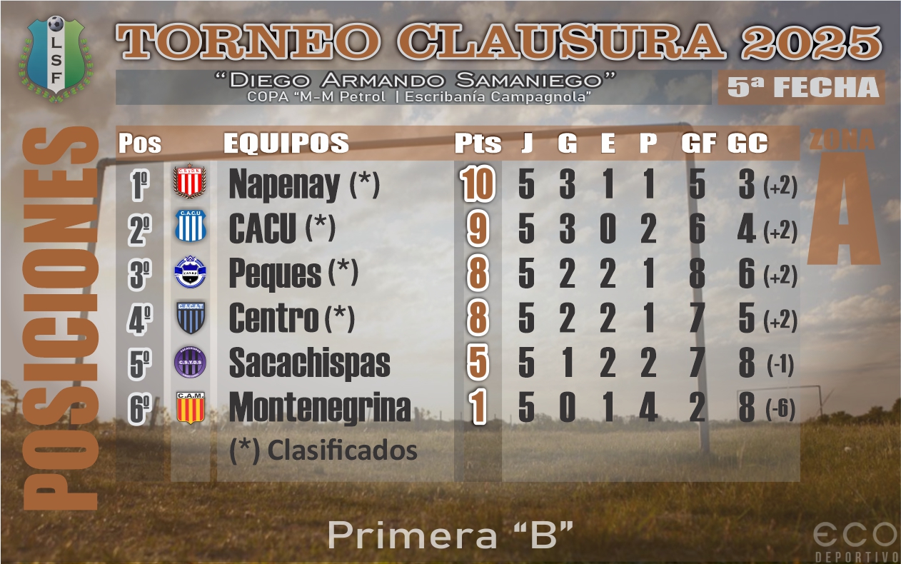 La quinta fecha del certamen permitió confirmar ya a cinco equipos en cuartos de final del certamen de ascenso, porque también se sumó Barrio Sarmiento de Castelli por una Zona “B” a la que le quedan tres plazas por ocupar en las próximas jornadas.