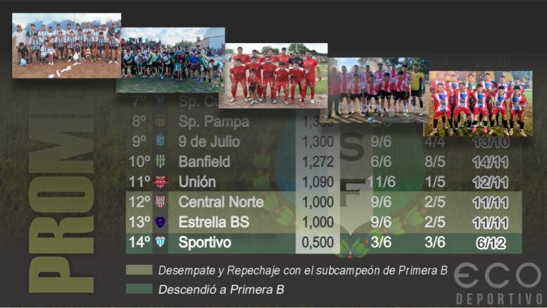 A falta de una sola jornada, los más comprometidos son Estrella del barrio Sur de Pampa del Infierno y Central Norte de Concepción del Bermejo, el último subcampeón. Ambos comparten el penúltimo lugar de los Promedios con 11 puntos en 11 partidos (1,000); pero también están en zona de riesgo Unión de Pampa Alegría (1,090), Banfield (1,272) y hasta 9 de Julio (1,300).