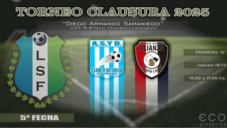 El Torneo Clausura “Diego Armando Samaniego” de la Liga Saenzpeñense de Fútbol quedará regularizado este jueves, cuando en Los Frentones se midan 9 de Julio y Alianza en compromiso pendiente de la quinta fecha. A las 15 será el duelo de tercera especial y a las 17 de primera división, con arbitraje de Rafael Rollhauser.