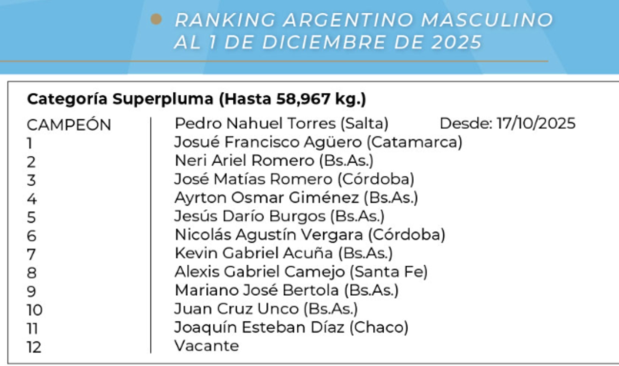 El púgil ocupa el 11º lugar en el ranking de categoría “superpluma” (58,967 kg.), aunque la mayor parte de su carrera la realizó en categoría “pluma” (57,152 kg.), donde da su peso natural. En el espacio donde se halla rankeado el campeón es el salteño Pedro Nahuel Torres, desde el 17 de octubre de este año.