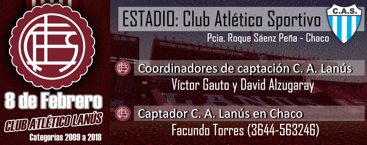 Con la presencia de los máximos responsables de captar nuevos valores, el Club Atlético Lanús recala en distintas poblaciones de la región con el objetivo de evaluar el desenvolvimiento de jugadores infanto juveniles. En Sáenz Peña, la actividad se cumplirá el domingo desde las 8 horas en las instalaciones del Club Atlético Sportivo.