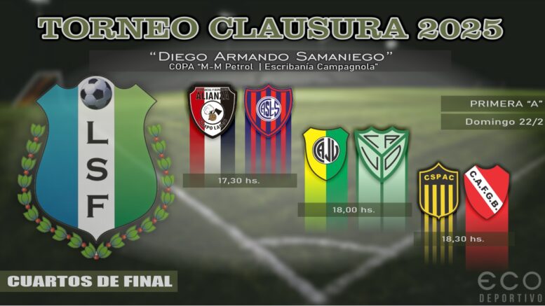 Tres partidos terminarán de confirmar este domingo los semifinalistas que restan para completar los cruces en el Torneo Clausura “Diego Armando Samaniego” de la Liga Saenzpeñense de Fútbol, cuando se enfrenten Alianza-San Lorenzo, Juventud-Vía y Obras, y Sportivo Pampa-Belgrano.