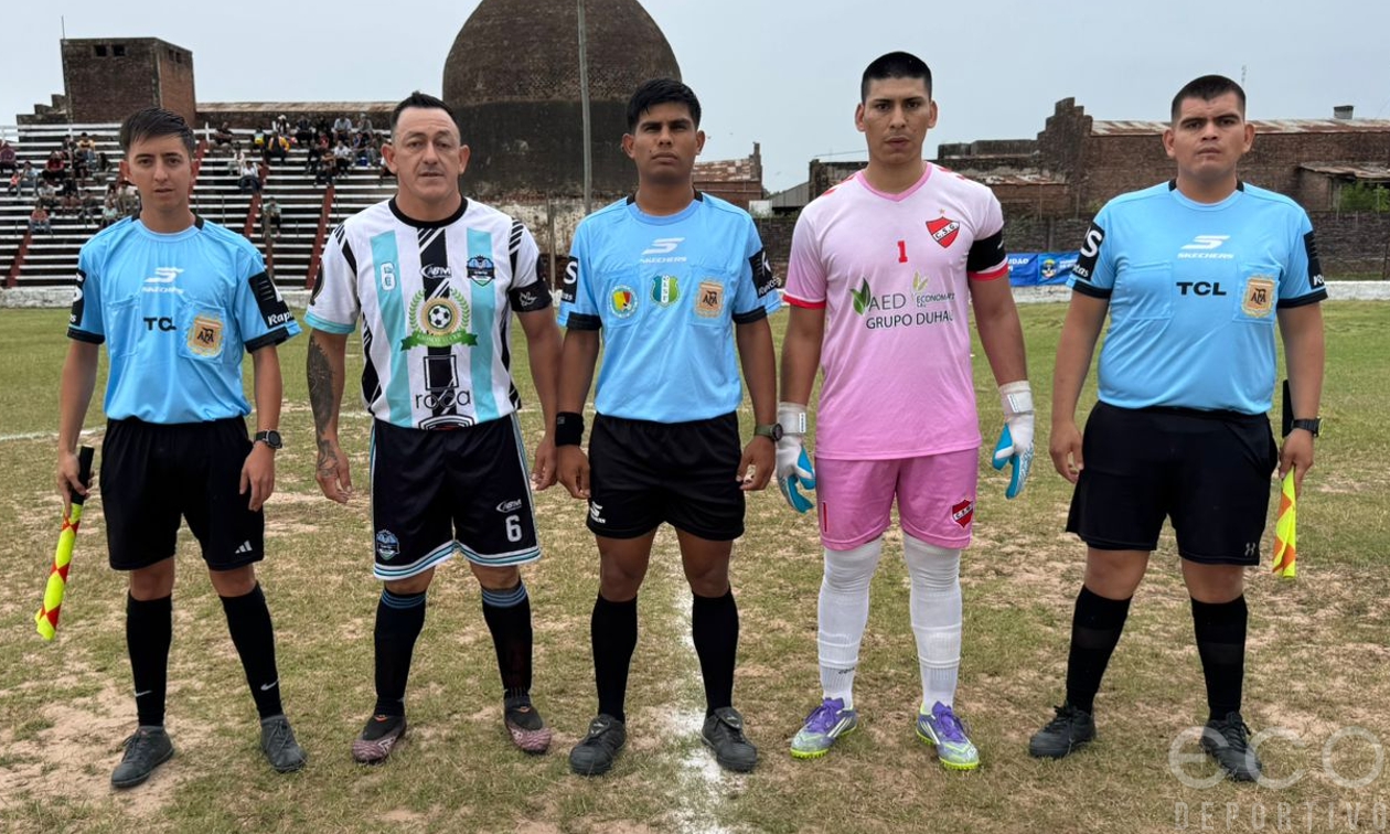 El árbitro Emanuel Gallardo con Santiago Gamarra y Emanuel Flores, de la Liga Saenzpeñense, junto con los capitanes
