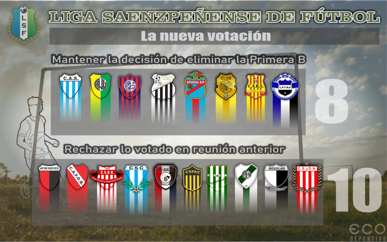 Con posturas opuestas que fueron esgrimidas desde una y otra posición, que demandó un acalorado debate, el Consejo Directivo de la Liga Saenzpeñense de Fútbol aprobó por mayoría rechazar la eliminación de la División B y mantener las dos categorías durante la presente temporada. Lo resuelto en la reunión de la semana pasada se dio marcha atrás por 10 votos a 8, y hubo una abstención.