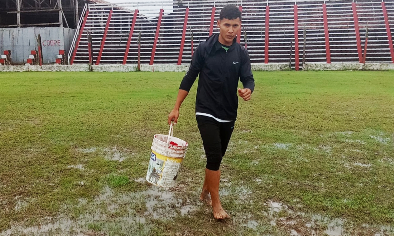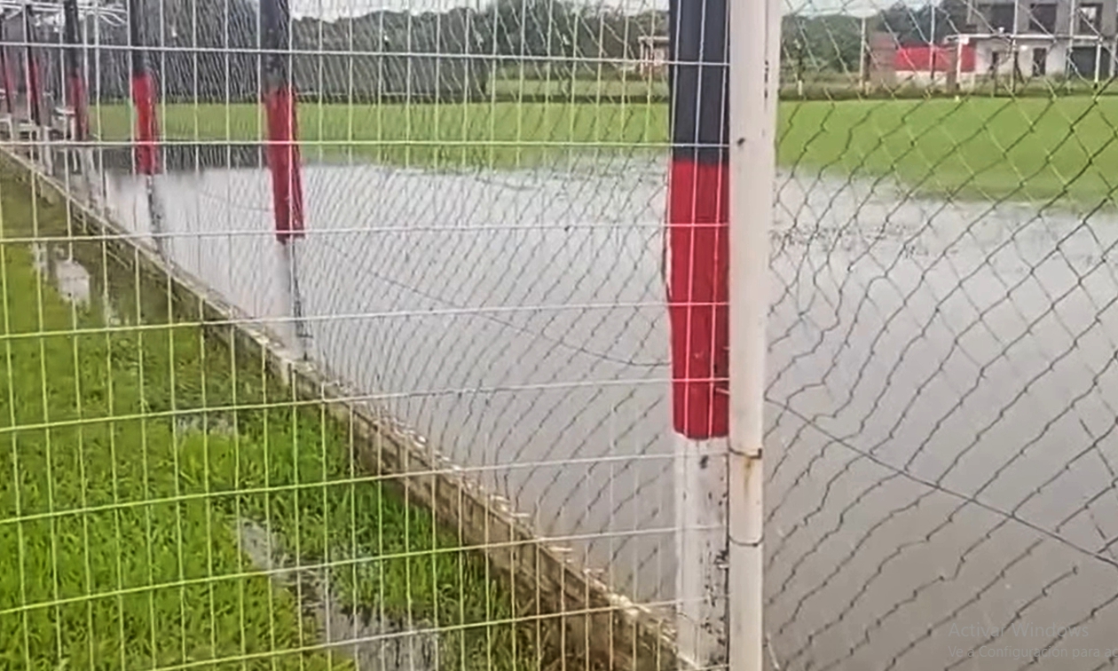 La cancha de Municipal de La Leonesa exhibe la gran cantidad de agua, que complicaba el partido con Belgrano de General San Martín