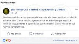 Aunque no se ofrecieron pormenores de tal decisión, la Comisión Directiva de Sportivo Pampa comunicó que el director técnico Juan Carlos Velozo decidió renunciar al…